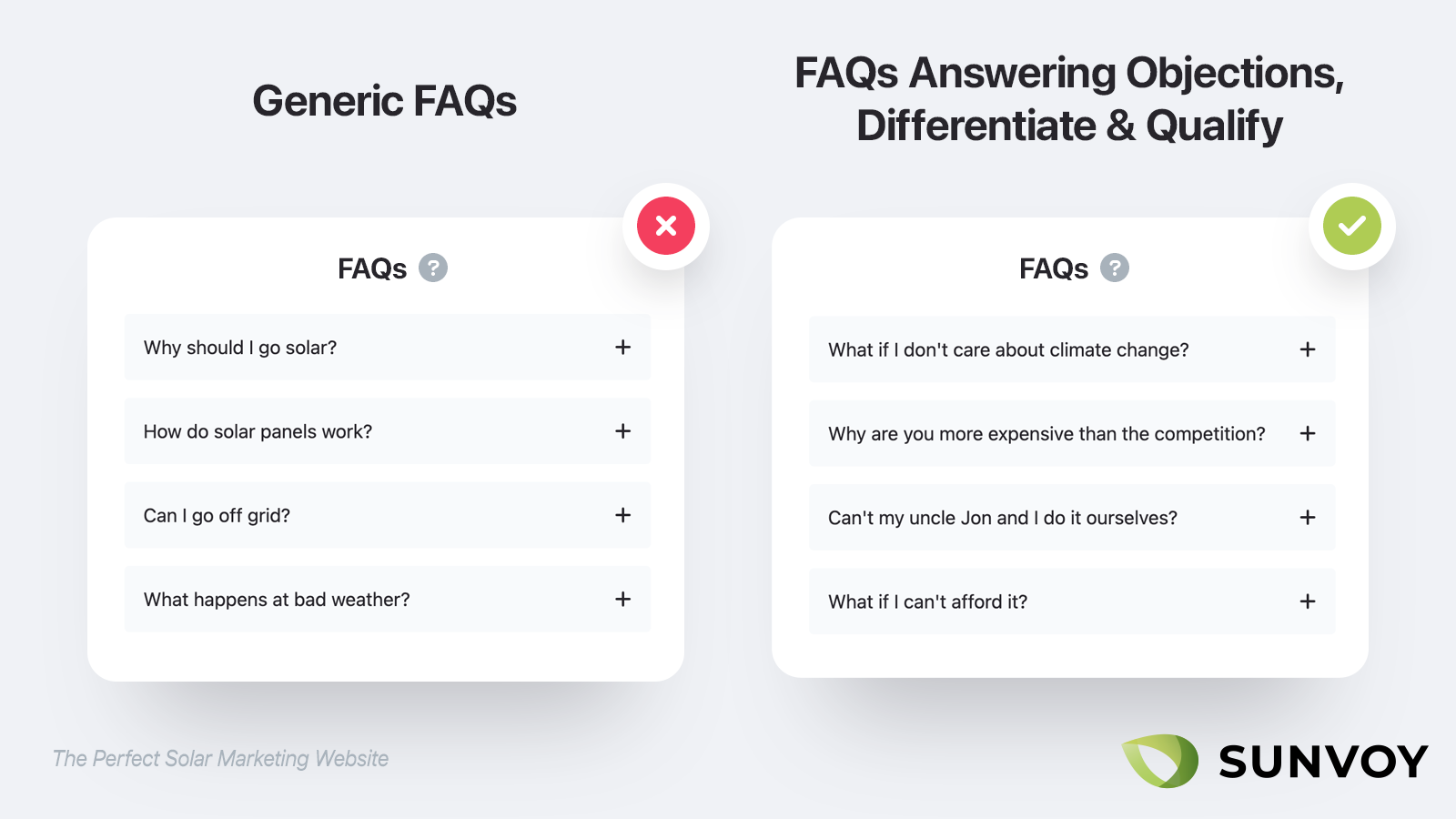 Tu web debería hacer lo mismo. Asegúrate de tener una sección de preguntas frecuentes. Pero en vez de incluir solo las preguntas que te hacen a menudo (y que pone todo el mundo), incluye también objeciones comunes que sabes que existen, pero que quizá no te dirían a la cara. Por ejemplo, "¿por qué sois más caros que la competencia?" es algo que muchos leads no te dirán, pero sí lo piensan.