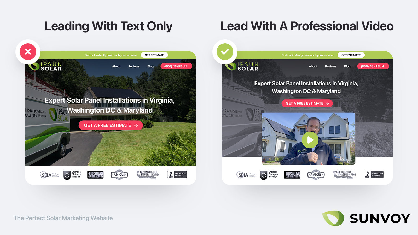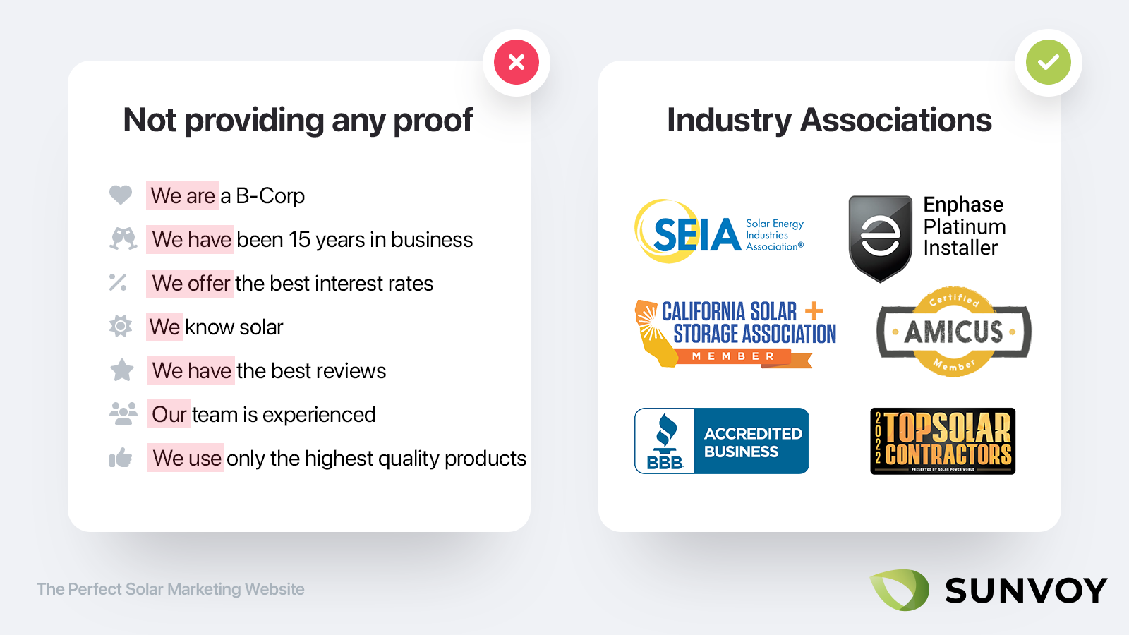 Si tienes certificaciones como NABCEP o perteneces a una asociación como California Solar, muestra también sus logos de forma destacada cerca de donde pides los datos de contacto.