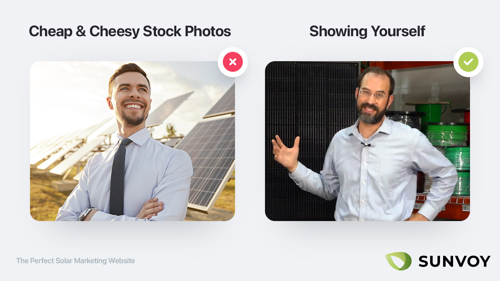 Graba también varios testimonios reales de clientes delante de sus casas, orgullosos de sus paneles recién instalados. Graba vídeos de distintos miembros del equipo: cómo llegaron a tu empresa, cuáles son sus responsabilidades del día a día y por qué eso le importa al cliente.